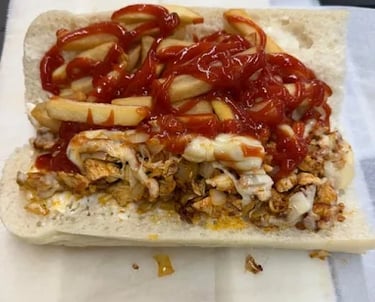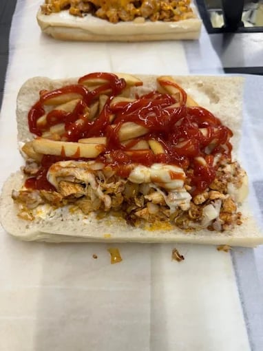 A massive local favorite featuring steak, melted cheese, mayo, ketchup, fried onions, and peppers served on a classic roll with a side of fries.